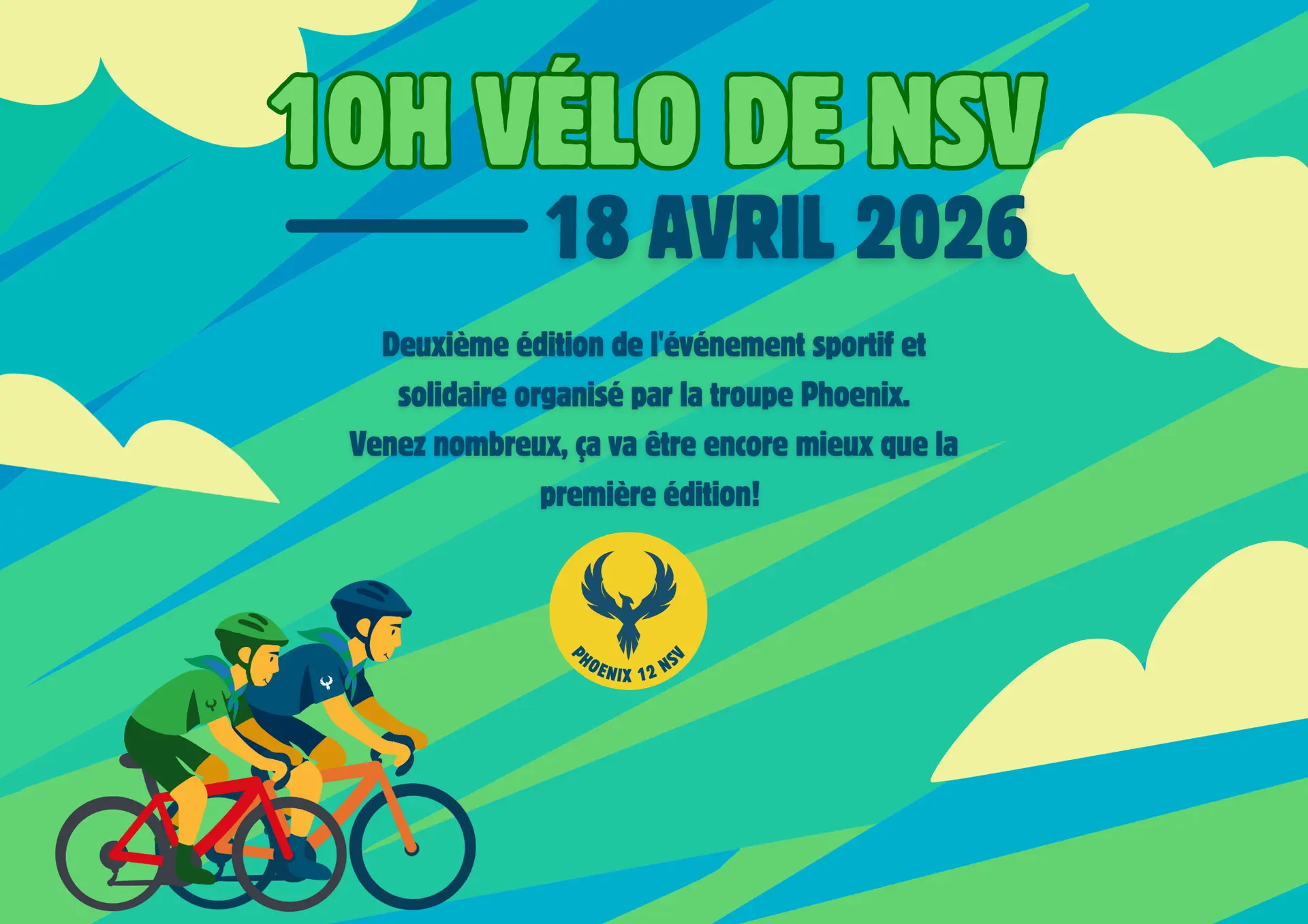 Les "10 Heures Vélo de NSV" est un grand événement scout organisé par la Troupe Phoenix de la 12e à Nil-Saint-Vincent. Cette année, l’événement rassemblera 8 à 10 troupes venues de toute la région, soit près de 400 à 500 animés, encadrés par 80 animateurs et soutenus par de nombreux visiteurs et parents. Pendant 10 heures non-stop, les scouts pédaleront en relais sur un circuit fermé, dans une ambiance à la fois festive et solidaire, avec un seul objectif : effectuer le plus grand nombre de tours possible ! chaque troupe a la possibilité d’inscrire jusqu’à 3 vélos.